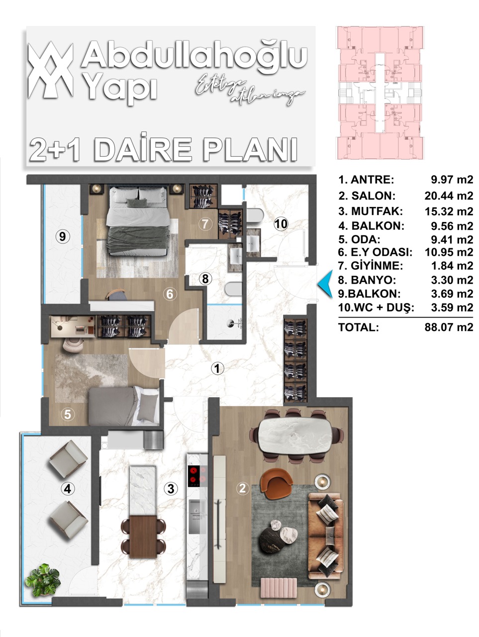 • 2+1 geniş ve kullanışlı daire seçenekleri